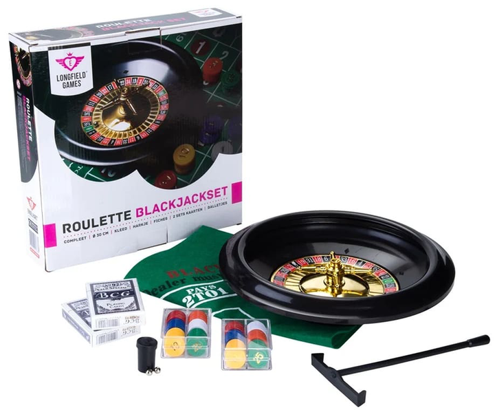 Zestaw do gier kasynowych: Ruletka i BlackJack zawiera wszystko, czego potrzebujesz by zorganizować kasyno rodem z Las Vegas we własnym domu! Ruletka o średnicy 30 cm, wykonana z plastiku, z dodatkiem złotej tarczy z cyframi, wyposażona w dwie profesjonalne kulki i dwustronną matę o wymiarach ok. 79,5 × 30 cm — na jednej stronie znajduje się układ ruletki amerykańskiej (z podwójnym zerem 00), na drugiej gra Blackjack. Do zestawu dołączone są 120 żetonów z nominałami, dwie talie kart, grabki krupiera oraz pudełko na kulki.