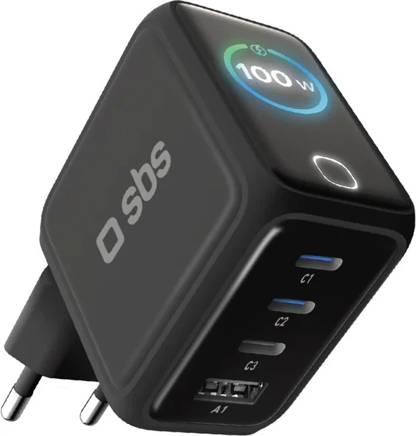 Ładowarka sieciowa SBS 100W 3xUSB-C 1xUSB-A TFT Display Black (TETRGANTFT100WK)