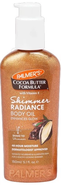 Palmer's Cocoa Butter Formula Shimmer Radiance to lekki olejek kosmetyczny stworzony, aby głęboko odżywić skórę i nadać jej luksusowy blask. Dzięki połączeniu naturalnego oleju kokosowego i oleju monoi, produkt intensywnie regeneruje nawet bardzo suchą skórę, nadając jej jedwabistą gładkość i elastyczność. Złote, odbijające światło cząsteczki w składzie natychmiast podkreślają kontury ciała, dodając mu eleganckiego blasku i zdrowego połysku.