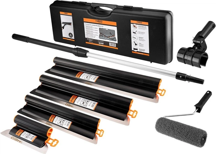 Zestaw szpachli do gładzi marki NEO TOOLS to 8-elementowy komplet szpachli PCV przeznaczonych do zaciągania gładzi gipsowych i wyrównywania tynków, pakowany w praktycznej walizce transportowej.