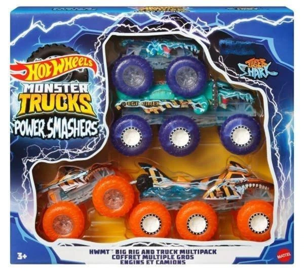 Цей набір Hot Wheels Monster Trucks Power Smashers поєднує транспортні засоби Tiger Shark та Mega-Wrex з відповідними 6-колісними вантажівками для епічних руйнівних заїздів. Кожен транспортний засіб масштабу 1:64 та відповідна вантажівка прикрашені яскравими, електризуючими декораціями Power Smashers, щоб посилити веселощі зіткнень, як у серіалі YouTube Kids. Буксируйте Tiger Shark за його вантажівкою та завантажте Mega-Wrex на його транспортер, а потім вирушайте в дію. Завдяки декоративній упаковці Power Smashers цей набір підвищує веселощі та колекціонування.