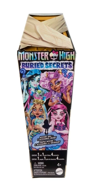 Zespół lalek Monster High Buried Secrets trzyma to w tajemnicy! Lalki Monster High Buried Secrets oferują ekscytujące doświadczenie rozpakowywania z tajemniczą lalką i 5 przytulnymi akcesoriami Creepover. Rozpakuj opakowanie mumii, aby dowiedzieć się, który krwawy upiór kryje się w opakowaniu sarkofagu – czy to Cleo De Nile, Draculaura, Frankie Stein, czy Claudine Wolfe? Straszna niespodzianka to połowa zabawy! Następnie otwórz opakowania w sarkofagu, aby znaleźć akcesoria Creepover, które stworzą upiorną atmosferę piżamowej imprezy! Postacie mogą się różnić. Lalka nie może stać samodzielnie. Kolory i dekoracje mogą się różnić.