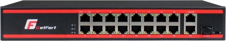 GetFort GF-218G-16P-200 to wysokowydajny 16-portowy przełącznik sieciowy z obsługą PoE, stworzony z myślą o małych i średnich biurach, systemach monitoringu IP i innych rozwiązaniach sieciowych. Urządzenie łączy porty Fast Ethernet, Gigabit Uplink i SFP, co zapewnia elastyczne połączenie i stabilną pracę sieci.