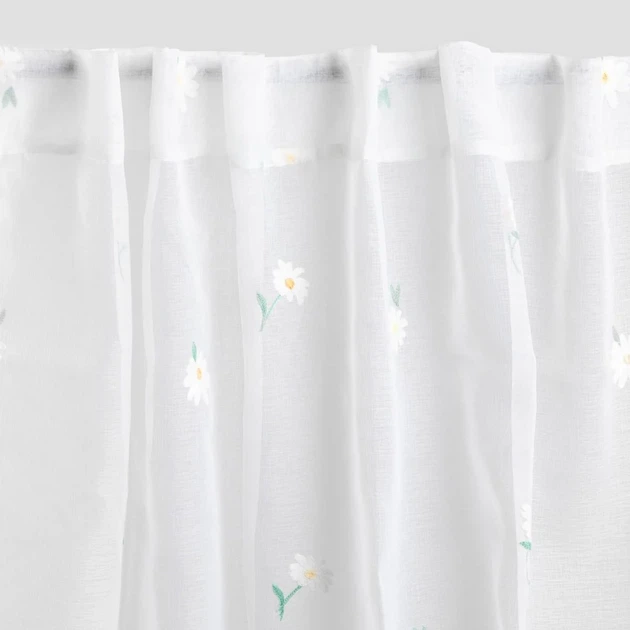 Firanka DAISY z haftowanymi kwiatami to elegancki i stylowy dodatek, który będzie prawdziwą ozdobą każdego wnętrza. Przezroczysta tkanina, ozdobiona delikatnym wzorem w kształcie stokrotek, nadaje pomieszczeniu szczególną świeżość, lekkość i tworzy przytulną, prywatną atmosferę. Doskonale harmonizuje z wnętrzami w stylu boho, rustykalnym lub skandynawskim, nadając pomieszczeniu niepowtarzalny i romantyczny charakter.