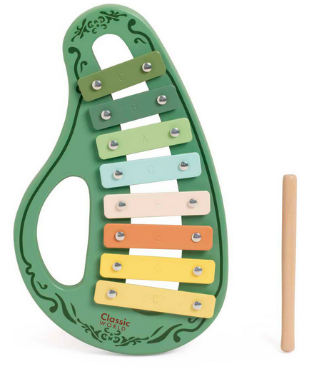 Classic World Wooden Vintage Xylophone Green to klasyczny instrument muzyczny dla dzieci, który pomaga maluchom rozwijać słuch muzyczny, poczucie rytmu i koordynację ruchową. Zestaw składa się z dwóch części: drewnianej podstawy i metalowych płyt pomalowanych na zielono.