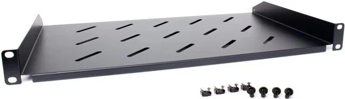 - Gotowość do instalacji: Półka jest dostarczana z kompletem czterech śrub montażowych, co eliminuje konieczność dokupowania dodatkowych akcesoriów i pozwala na szybkie przymocowanie do szyn rack.