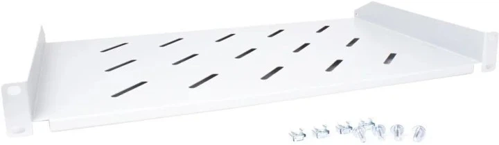 - Gotowość do instalacji: Półka jest dostarczana z kompletem czterech śrub montażowych, co eliminuje konieczność dokupowania dodatkowych akcesoriów i pozwala na szybkie przymocowanie do szyn rack.