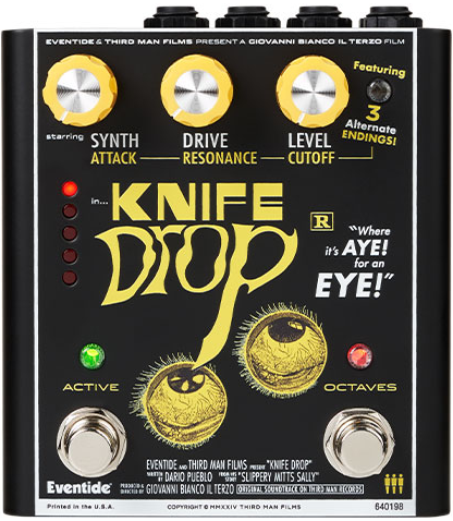 Eventide Knife Drop to efekt gitarowy dla gitarzystów poszukujących agresywnego, niestandardowego i bardzo charakterystycznego brzmienia. Model łączy suboktawowy fuzz, monofoniczny analogowy charakter syntezatora i wyraźną filtrację, tworząc gęste, brudne, nasycone brzmienie — od szorstkiego octave-fuzz do niemal syntezatorowych tekstur. Efekt został stworzony przez Eventide we współpracy z Third Man Hardware i Jackiem White'em.