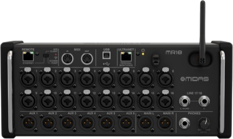 MIDAS MR18 to cyfrowy mikser z serii M-Air z 18 wejściami, z czego 16 wyposażono w legendarne przedwzmacniacze MIDAS PRO. Mikser stworzony do współpracy z iPadem i tabletami z systemem Android, ze zintegrowanym modułem WiFi a także wielokanałowym interfejsem audio USB.