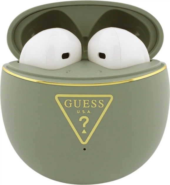 Kolor khaki nadaje słuchawkom wyjątkowego i minimalistycznego wyglądu. Złote logo marki Guess na obudowie dodaje im luksusowego akcentu.