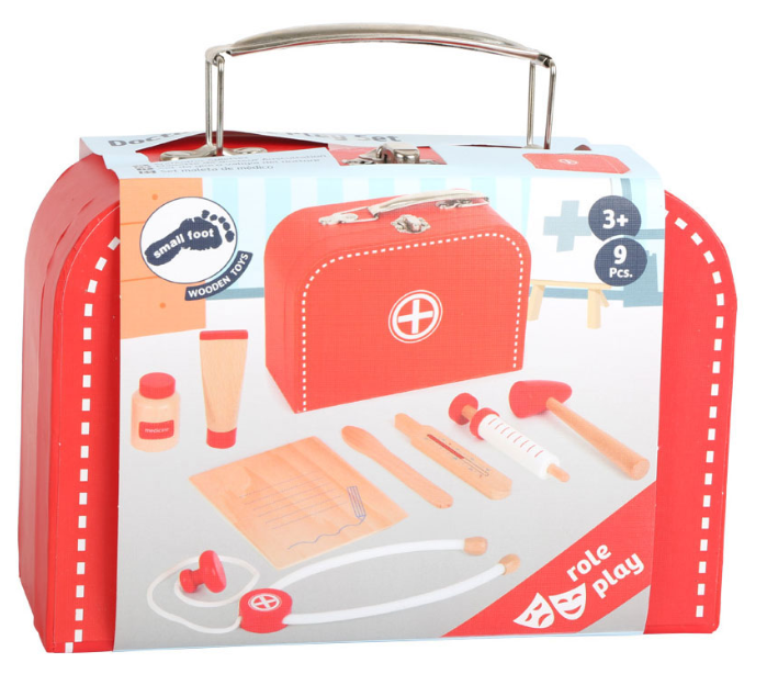 Drewniany zestaw lekarski Small Foot to idealna zabawka dla dzieci, które lubią pomagać innym i odgrywać role lekarza. Dzięki praktycznej walizce wszystkie akcesoria są zawsze pod ręką, a mali lekarze mogą szybko udzielić pomocy swoim pacjentom – pluszakom, lalkom czy przyjaciołom.