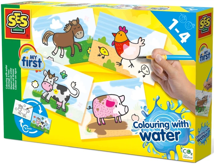 SES My First Colouring with Water – Farm — to zestaw edukacyjny dla najmłodszych, który pozwala rysować bez farb i bez bałaganu. Wystarczy zwilżyć pędzelek wodą i przesunąć po kartce — obrazek ujawni się w kolorach.