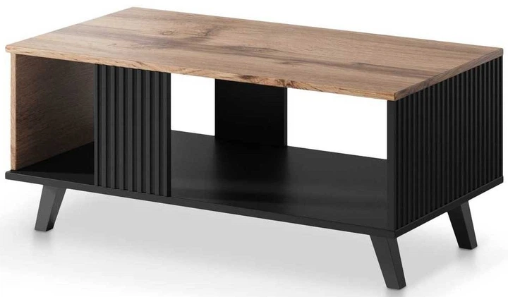 Ława z kolekcji Random to stylowe i praktyczne rozwiązanie do salonu. Połączenie ciepłego odcienia dębu wotan z głęboką czernią tworzy modny i elegancki efekt.