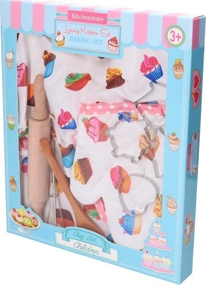 W skład zestawu wchodzą: fartuszek wiązany, czapka kucharska, drewniana łyżka, wałek, trzepaczka, cztery foremki do ciasteczek, ściereczka oraz rękawica. Wszystkie elementy wykonane są z bezpiecznych i trwałych materiałów, a tkaniny zdobi uroczy wzór kolorowych babeczek i muffinek.