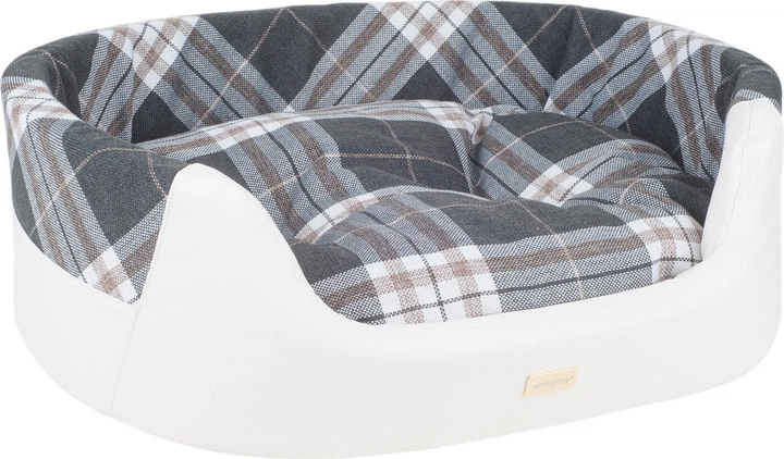 Seria Amiplay Kent została stworzona z wykorzystaniem materiałów najwyższej jakości z dbałością o stylowe wykończenie. Zewnętrzna część legowiska oraz jedna strona poduszki zostały wykonane ze stylowej i łatwej w utrzymaniu czystości skóry syntetycznej. Połączona ona została z tkaniną w piękny, klasyczny wzór w kratę. Użyte tkaniny cechują się wysoką odpornością na ścieranie oraz uszkodzenia mechaniczne.