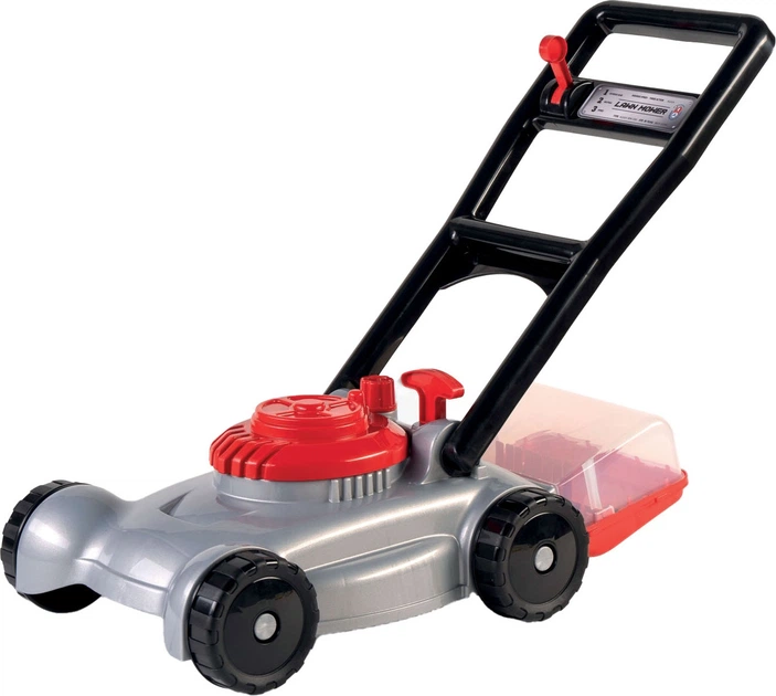 Zabawkowa kosiarka do trawy wykonana z plastiku dla dzieci, z obrotowym mechanizmem tnącym, który zrzuca małe „kulki trawy” do pojemnika. Kosiarka posiada regulowaną i składaną rączkę oraz różne ruchome przyciski. Wymiary: 63 x 29 x 45 cm. Odpowiednia dla dzieci w wieku od 18 miesięcy.