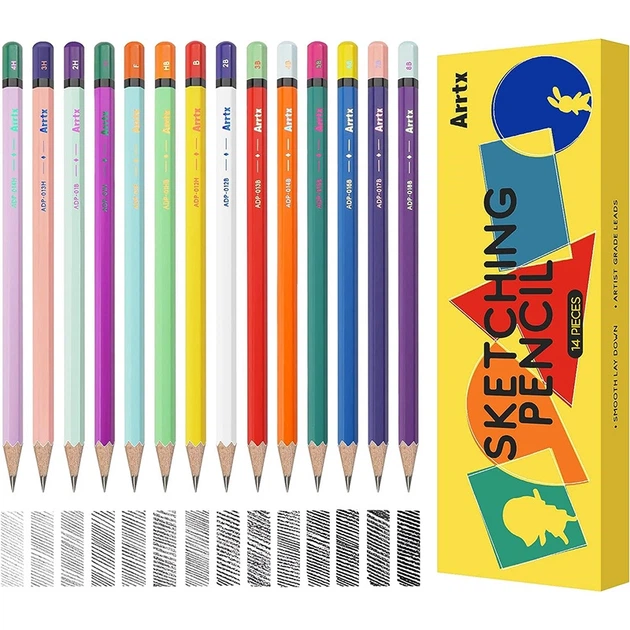 Набір професійних олівців для малювання Arrtx складається з 14 високоякісних олівців графітових (4H 3H 2H H F HB B 2B 3B 4B 5B 6B 7B 8B). Кожен олівець має унікальне колірне рішення, що відповідає естетиці художника. Ці олівці для малювання НЕ мають попереднього заточування. Виготовлені з високоякісного свинцю, олівці для ескізів Arrtx легко заточуються та стираються. Удосконалена технологія склеювання забезпечує виняткову міцність графітових стрижнів на злам, що дозволяє робити начерки протягом тривалого часу, не побоюючись ламання кінчика. У конструкції олівця приділено пильну увагу деталям, а нековзне руків'я забезпечує зручність використання та контролю. Це гарантує точність та акуратність під час виконання ескізів та одночасно забезпечує комфортне малювання олівцем Arrtx.