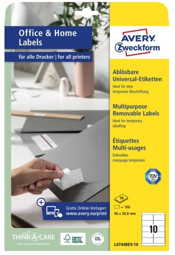 Zdejmowane uniwersalne etykiety Avery L4744REV-10 są przeznaczone do użytku w pomieszczeniach. Umożliwiają szybkie tworzenie tymczasowych oznaczeń, które można łatwo usunąć bez pozostawiania śladów kleju. Nadają się do oznaczania drukarek, dokumentów, teczek i segregatorów, a także do tymczasowych notatek i instrukcji. Są kompatybilne z większością typów drukarek i bezpieczne do drukowania dzięki gwarancji JamFREE.