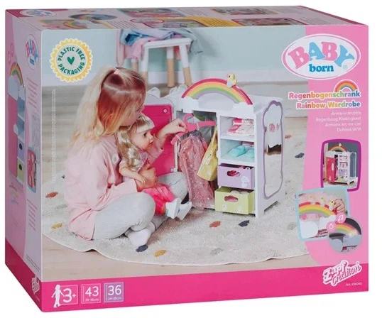 Z tęczową szafą BABY born przebieranie się to świetna zabawa! Berta gra wesołą melodię przy wyborze stroju, która nadaje jej dobry nastrój. Dzięki drążkowi na ubrania, półkom i szufladom w szafie jest wystarczająco dużo miejsca na ubrania dla lalek. Torby lub podobne przedmioty można zawiesić na uroczych haczykach w kształcie chmurek na zewnątrz szafy. Cały strój BABY born można podziwiać w lustrze w całej długości. Sama szafa może być jeszcze bardziej kolorowa dzięki arkuszowi naklejek. Działa na baterie 3 x LR03/AAA.