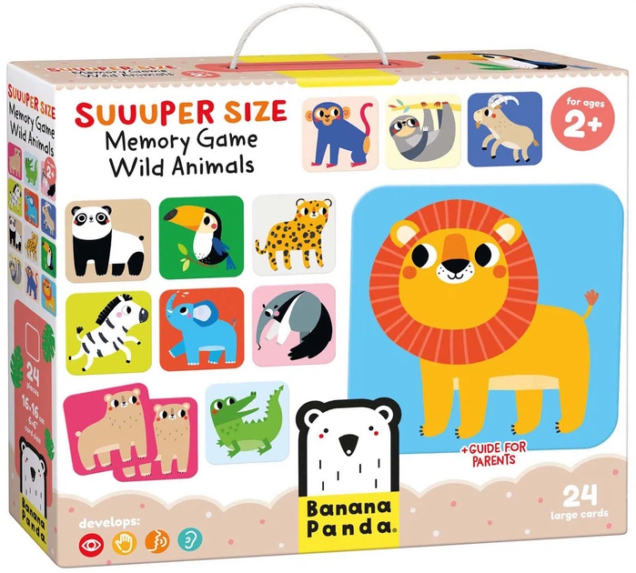 Zagrajmy w grę pamięciową z dzikimi zwierzętami! Połącz szczęśliwe słonie, głodne mrówkojady, leniwe leniwce i innych zwierzęcych przyjaciół! Ten edukacyjny zestaw zawiera 24 duże i wytrzymałe karty i jest idealną pierwszą grą pamięciową.