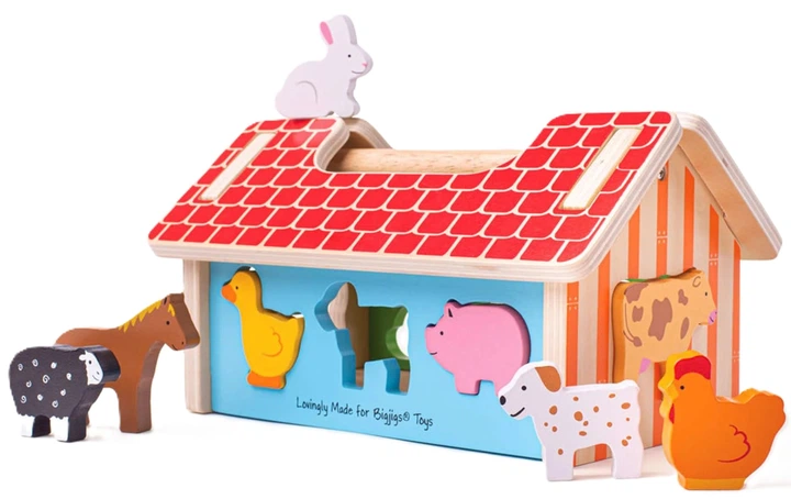 Дерев'яна сортувальна коробка у формі ферми. Після того, як ви розмістите всіх тварин на фермі, ви можете зняти дах і почати все спочатку. Зручна ручка дозволяє легко переносити ферму куди завгодно.