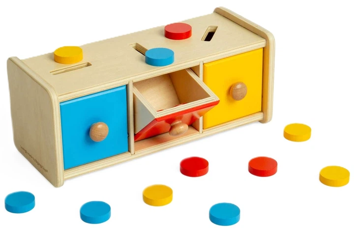 Познайомте свою малечу з кольорами за допомогою нашого навчального дерев'яного сортувальника фішок. Він постачається з 15 фішками трьох яскравих кольорів та набором із трьох шухлядок з прорізами. Малюки можуть легко групувати фішки за відповідними кольорами, а потім розміщувати їх у відповідні за кольором прорізи. Ця проста іграшка для сортування заохочує малюків навчатися через гру та є цікавим способом навчити дітей розпізнавати та ідентифікувати різні кольори.