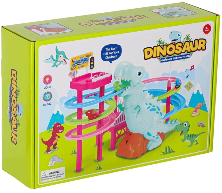 Tor wyścigowy z dinozaurem, który połyka samochodziki w kształcie małych dinozaurów, będzie doskonałą rozrywką dla dzieci. Bawiąc się samochodzikami, dzieci poznają trajektorię ruchu, prędkość, odległość, grawitację, ciężar i wiele innych rzeczy. Gra rozwija motorykę, koordynację wzrokowo-ruchową i zręczność. Zabawka posiada efekty dźwiękowe.