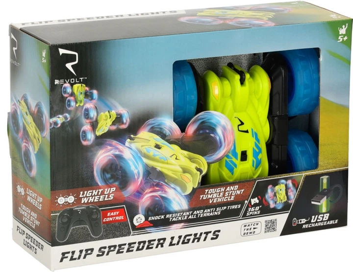 Zdalnie sterowany samochód Revolt Flip Speeder łączy szybkość, zwrotność i wytrzymałość. Gumowe koła o średnicy 7 cm z podświetleniem zapewniają dobrą przyczepność oraz efektowny wygląd po zmroku. Pilot o zasięgu do 30 m i częstotliwości 2,4 GHz gwarantuje stabilny sygnał bez zakłóceń. Akumulator 3,7 V 500 mAh umożliwia do 15 minut zabawy po 90 minutach ładowania.