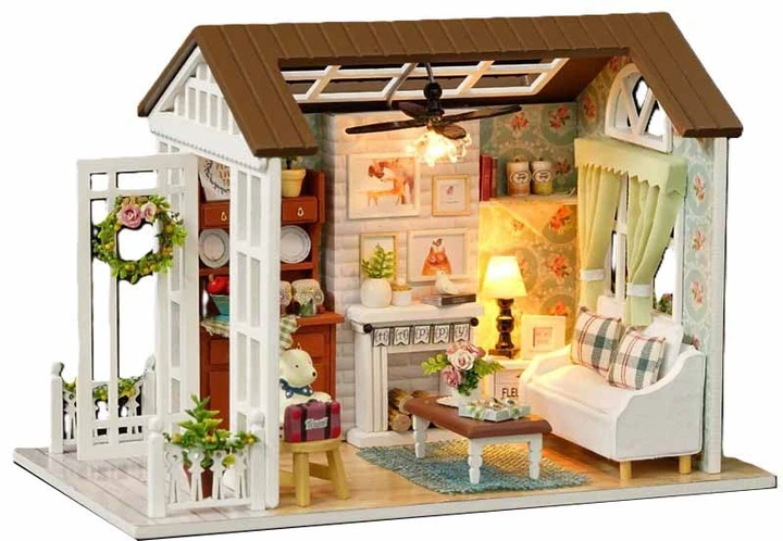 Zestaw pozwala samodzielnie złożyć stylowy, drewniany pokój w stylu retro. W środku znajdują się 3 lampki LED zasilane bateriami: 2 × AAA 1.5 V oraz 3 × 1.5 V LR54 (baterie nie są w zestawie).
