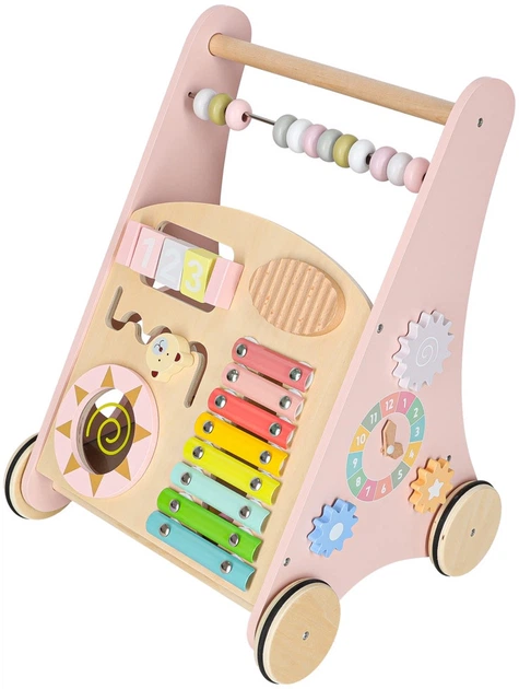 Wspieraj pierwsze kroki malucha dzięki drewnianym chodzikom-pchaczom — bezpiecznemu centrum zabawy do nauki chodzenia i wczesnego rozwoju. Stabilna konstrukcja z uchwytem oraz gumowane kółka pomagają utrzymać równowagę, a elementy interaktywne rozwijają motorykę, logiczne myślenie i zmysły. Chodzik łączy funkcję pchacza z zabawką edukacyjną: sorter kształtów, liczydło, ksylofon, labirynt z koralikami, zębatki oraz zegar. Wykonany z naturalnego drewna i pomalowany bezpiecznymi farbami na bazie wody. Odpowiedni dla dzieci od 12 miesięcy.