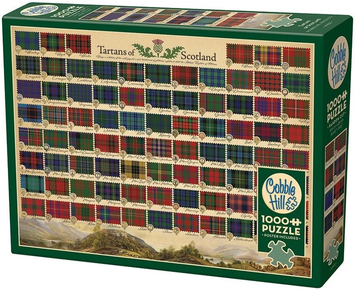 Szkockie tartany - układanka 1000 elementów łączy piękne wzory z nazwiskami popularnych szkockich rodów. Zaprojektowane przez Cobble Hill Creations.