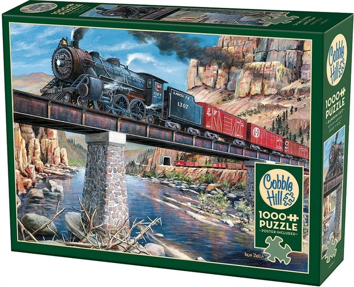 Відчуйте силу каменю, сталі та пари, коли поїзд Санта-Фе проїжджає по мосту над водою сонячного дня. Навіть попри звук поїздного дзвінка та рев локомотива, це мальовниче місце створює відчуття спокою. Цей пазл із 1000 елементів містить картину Кена Зілла.