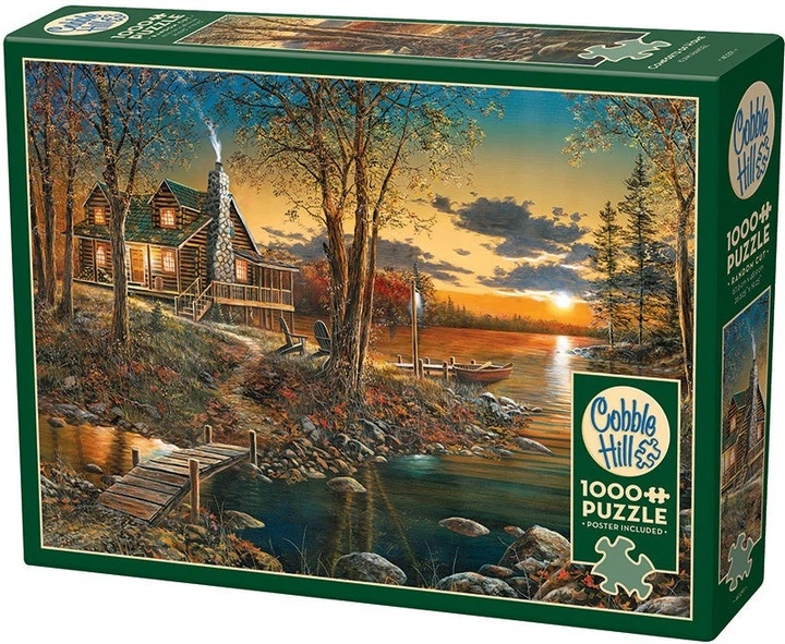 Odkryj uroki domu dzięki temu uroczemu domkowi z bali nad spokojnym jeziorem o zachodzie słońca, otoczonemu kolorowymi jesiennymi liśćmi i skalistym terenem. Widok dymu unoszącego się z komina budzi poczucie ciepła i komfortu. Ta układanka pięknie oddaje spokój jesiennego wieczoru, oferując relaksujące i satysfakcjonujące wyzwanie - o każdej porze roku. Cobble Hill z przyjemnością prezentuje sztukę Jima Hansela w tej 1000-elementowej układance.