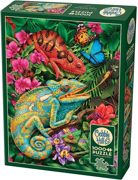 Kto ma teraz Culture Club w głowie? Ktoś? Karma Chameleon eksploduje jaskrawymi kolorami i osobowością. Kameleony znane są z kamuflażu, więc ta układanka nie byłaby idealna bez małego ukrytego gada w scenie. Zauważyliście go? Te trzy zaprzyjaźniły się z motylami, ale zwykłe muchy nie mają tyle szczęścia, bo ten długi język wyskakuje, by zjeść smaczną przekąskę w ten piękny popołudniowy czas w dżungli. Ekscytująca układanka od Lori Anzalone.