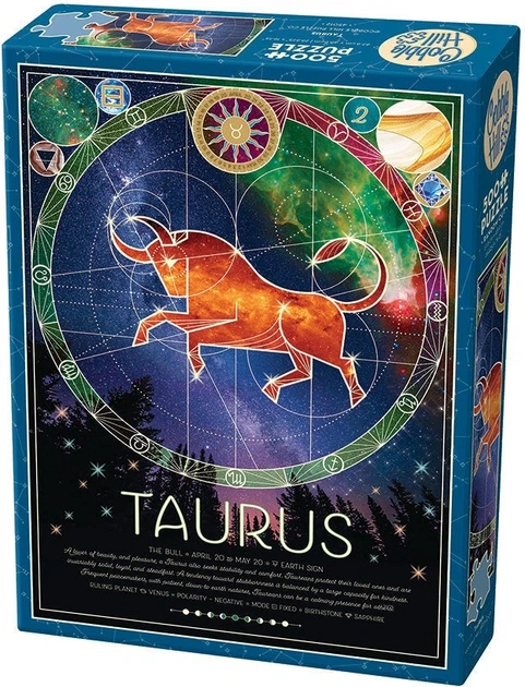 Każdy 500-elementowy puzzle Zodiaku zawiera konstelację, symbol, planetę rządzącą, polaryzację, tryby i kamienie.