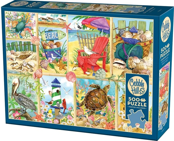 Хіба ж вам не хотілося б провести ідеальний «День на пляжі»? Насолоджуйтесь цим яскравим колажем із зображенням моря, що містить дев'ять чарівних сцен, які миттєво перенесуть вас у сонячний рай. Уявіть, що ви розслабляєтеся в яскраво-червоному кріслі Адірондак, спостерігаючи за ніжними хвилями, що накочуються, поки поруч будуються величні піщані замки.