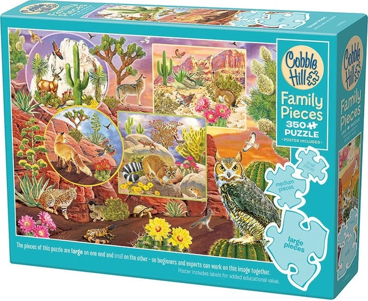 У Магії пустелі йдеться про виживання, тож приготуйтеся до розгадування цієї головоломки про дику природу! Тут немає води, тому обов’язково візьміть свою, коли розв’язуватимете цей міні-колаж-головоломку «Сімейні шматочки 350» від Розіланд Соломон. Ви відкриєте для себе різноманітних тварин: сов, лисиць, оленів, кроликів, рисей, гризунів, черепах та інших. Ця головоломка може бути складнішою через свою бурштиново-зелену кольорову гаму, але завдяки квітучим кактусам та небу в міні-колажах також є спалахи кольору.