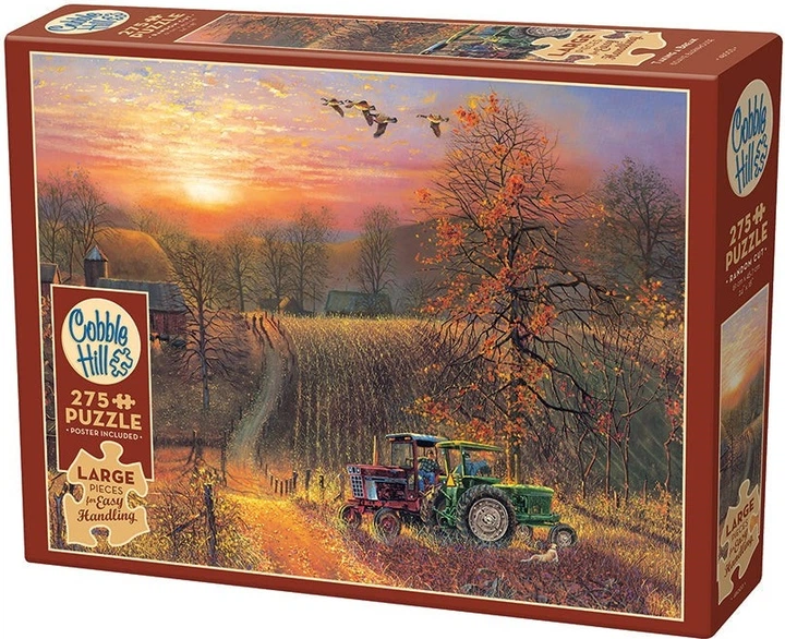 На відміну від птахів, що пильно літають над сараями, собака та двоє фермерів, здається, відпочивають від важкого робочого дня під осіннім сонцем. Поля ретельно підготовлені тракторами, і все виглядає багатообіцяюче для майбутнього осіннього сезону. Це складний пазл із 275 елементів, який легко зібрати, завдяки схожості коричневого та помаранчевого кольорів. Цей пазл точно підійде тим, хто має трохи більше навичок розпізнавання, але кожен знайде його приголомшливим після завершення!