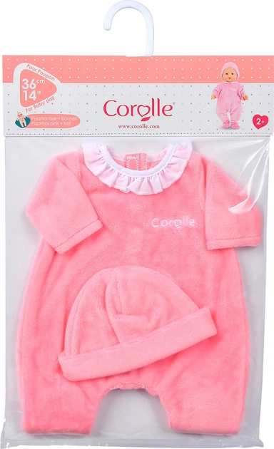 Różowa piżama wraz z pasującą czapeczką, przeznaczona dla lalek Corolle Mon Grand Poupon o wysokości 36 cm. Zestaw wykonany jest z bawełny i idealnie nadaje się do zabawy w wieczorne usypianie ulubionej laleczki. Produkt jest odpowiedni dla dzieci od 2. roku życia.