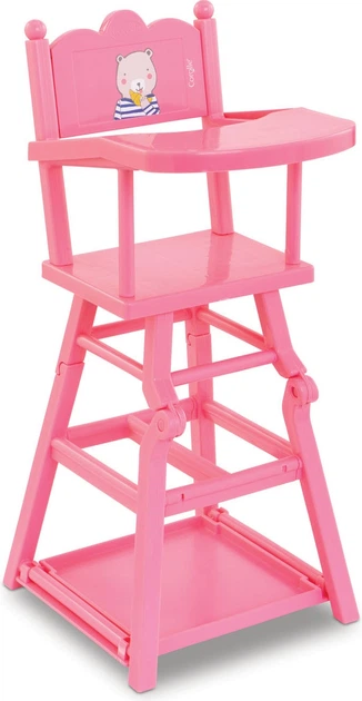 Różowe krzesełko dla lalek z dwoma różnymi pozycjami: wysokie krzesełko do karmienia lub krzesełko z stolikiem. Pod względem rozmiaru plastikowe krzesełko dla lalek idealnie pasuje do lalki Mon Grand Poupon marki Corolle lub lalek o wysokości około 42 cm.