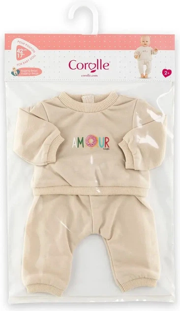 W przypadku stroju codziennego beżowy zestaw do joggingu (2-częściowy) jest idealnym ubraniem dla dużych lalek Mon Grand Poupon Corolle o średnicy 42 cm. Ten wygodny strój składa się z beżowej bluzy z długim rękawem, ozdobionej pięknym kolorowym sitodrukiem "Amour" i beżowymi spodniami dresowymi. Zestaw wykonany jest z miękkich i wytrzymałych materiałów i jest łatwy do założenia dzięki zamknięciom na rzepy dostosowanym do zwinności małych dłoni.