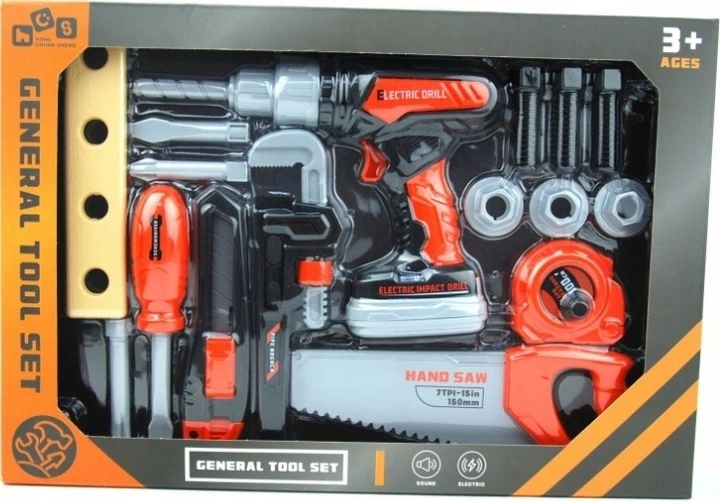 Podczas skręcania, dopasowywania i montowania części dziecko ćwiczy sprawność dłoni, koordynację ruchową oraz logiczne myślenie. W zestawie znajduje się między innymi deseczka z otworami, śruby i nakrętki, piła, klucz, śrubokręt z wymiennymi końcówkami oraz zabawkowa wkrętarka na baterie, które pozwalają tworzyć coraz bardziej pomysłowe konstrukcje i uczyć się podstawowych czynności znanych z domowego warsztatu.