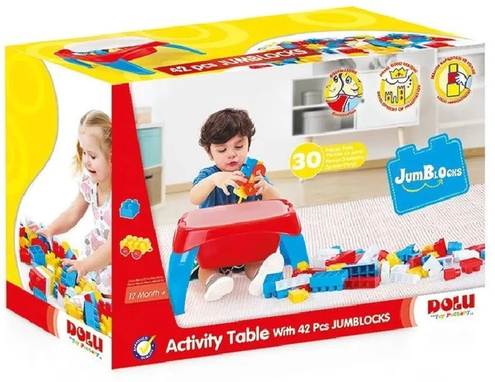 Połączenie kreatywnej zabawy z praktycznym rozwiązaniem do pokoju dziecka! Stolik aktywności Dolu to kompaktowy, kolorowy zestaw, który łączy stolik do zabawy z dużymi klockami konstrukcyjnymi. W zestawie znajduje się aż 30 elementów Jumbo Blocks, idealnych dla małych rączek.
