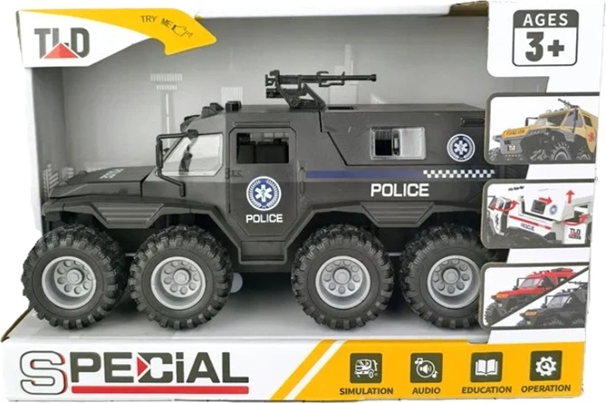 Ця бойова машина в поліцейському стилі одразу привертає увагу своїм масивним виглядом та деталями, що нагадують справжні машини, що використовуються в спеціальних операціях. Великі колеса, темні кольори та чітке маркування підрозділів виділяють іграшку на полиці та спонукають до захопливих сцен.