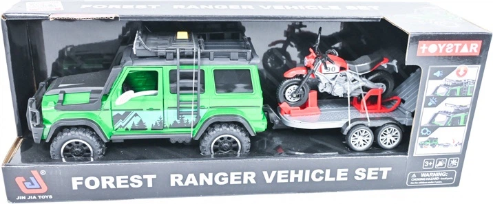 - Zestaw zawiera: samochód terenowy, przyczepę oraz motocykl