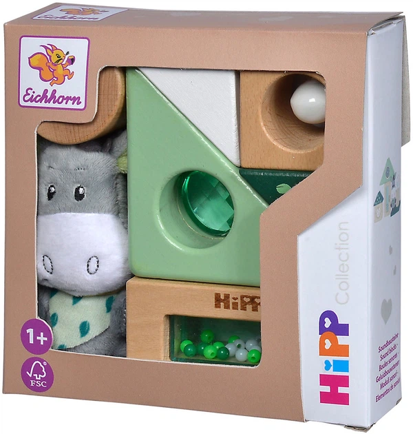 Klocki dźwiękowe Eichhorn Baby HiPP Collection: 7 klocków dźwiękowych i pluszowy osiołek z kolekcji Eichhorn Baby HiPP Collection, dostępne w różnych kolorach i kształtach, to idealne zabawki dla wszystkich małych odkrywców. Każdy klocek, wykonany z wysokiej jakości drewna bukowego, zawiera koraliki, dzwoneczek lub inne elementy sensoryczne. Sprzyja to rozwijaniu słuchu muzycznego, zdolności motorycznych i koordynacji wzrokowo-ruchowej dziecka.