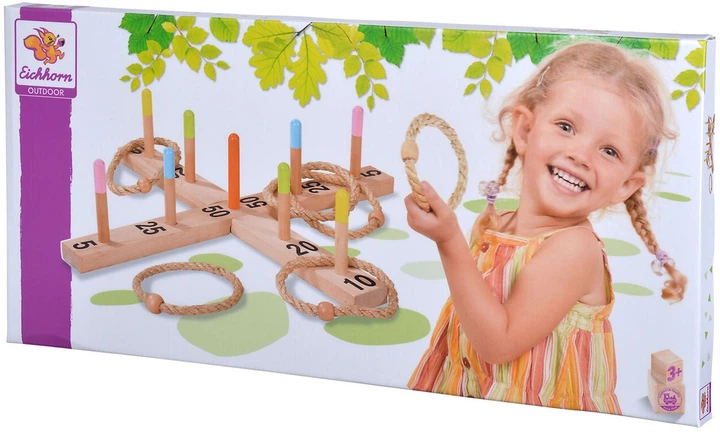 Drewniana gra w rzucanie obręczami od Eichhorn Outdoor. Fantastyczna zabawa w ogrodzie lub parku! Drewniany krzyż ma kolorowe kołki z odpowiadającymi im punktami. Rzucaj obręczami w krzyż i staraj się zebrać jak najwięcej punktów. Ten, kto zdobędzie najwięcej punktów, wygrywa!