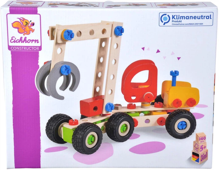 Zrób własne zbiory dzięki zestawowi Eichhorn Constructor 3 w 1. Połącz 140 kolorowych elementów z drewna i wytrzymałego plastiku, aby stworzyć ten fajny pojazd.