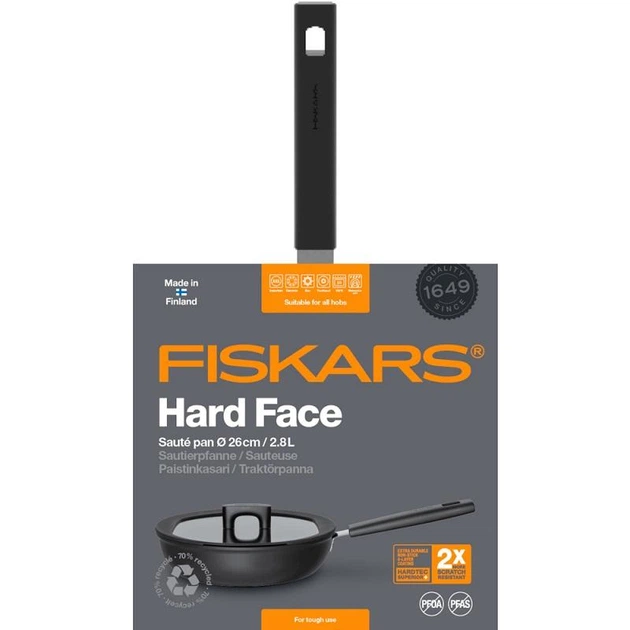 Сковорода із кришкою Fiskars Hard Face для складних завдань з приготування їжі. Найміцніший шар Hardtec Superior має відмінні антипригарні властивості, забезпечуючи легке приготування та догляд. Скляна кришка із силіконовим обідком має вбудовану функцію зливу. Товстий алюмінієвий шар із відмінною теплопровідністю та міцним дном рівномірно та ефективно розподіляє тепло. Бакелітова ручка залишається холодною під час приготування.