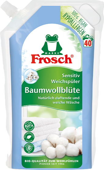 Płyn do płukania tkanin Frosch Cotton Blossom Sensitive jest wegański i oparty na roślinach, dzięki czemu pranie pozostaje pachnące i miękkie. Nie nadaje się do wełny, jedwabiu ani mikrofibry. Formuła z ekstraktem z kwiatów bawełny delikatnie pielęgnuje i wygładza włókna, nadając praniu świeży zapach. Przyjazna dla skóry formuła ze starannie dobranymi zapachami nie zawiera konserwantów. Produkt testowany dermatologicznie i hipoalergiczny.